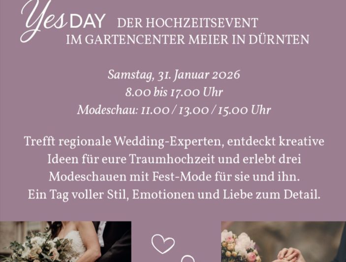 Am Samstag, 31. Januar bleibt unser Salon geschlossen, da wir als Aussteller am Yes Day Hochzeitsevent im Gartencenter Meier in Dürnten vor Ort sind.